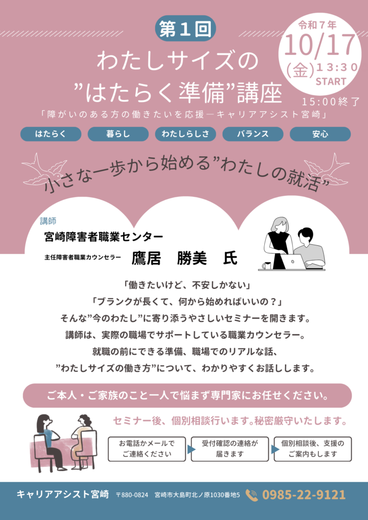 講師には、宮崎障害者職業センター 主任障害者職業カウンセラーの鷹居 勝美 氏をお迎えし、実際の職場でのサポート経験をもとに、就職前にできる準備や職場でのリアルな話、”わたしサイズ”の働き方についてわかりやすくお話しいただきます。